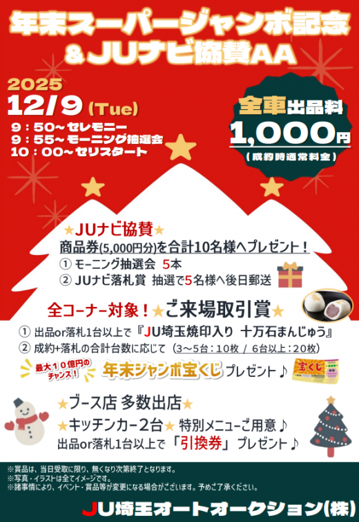 オークション会場 > JU埼玉オートオークションのイベント一覧 > 年末スーパージャンボ記念&JUナビ協賛AA/JU埼玉オートオークション