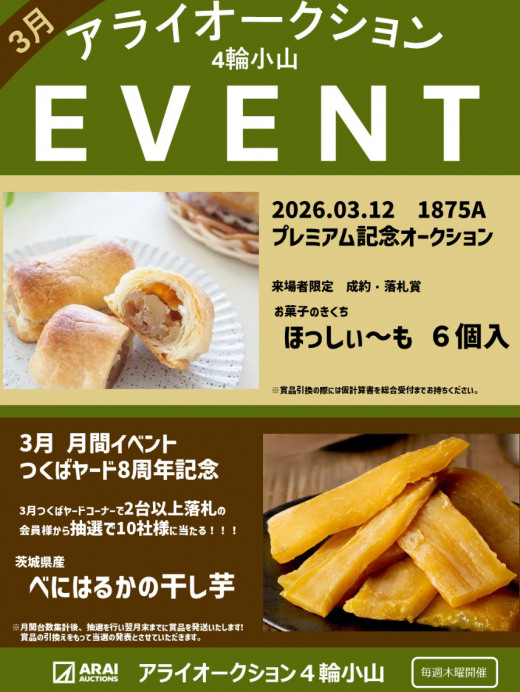 オークション会場 > 2026年03月19日 > つくばヤード開設8周年月間 プレミアム記念A/アライオークション4輪小山