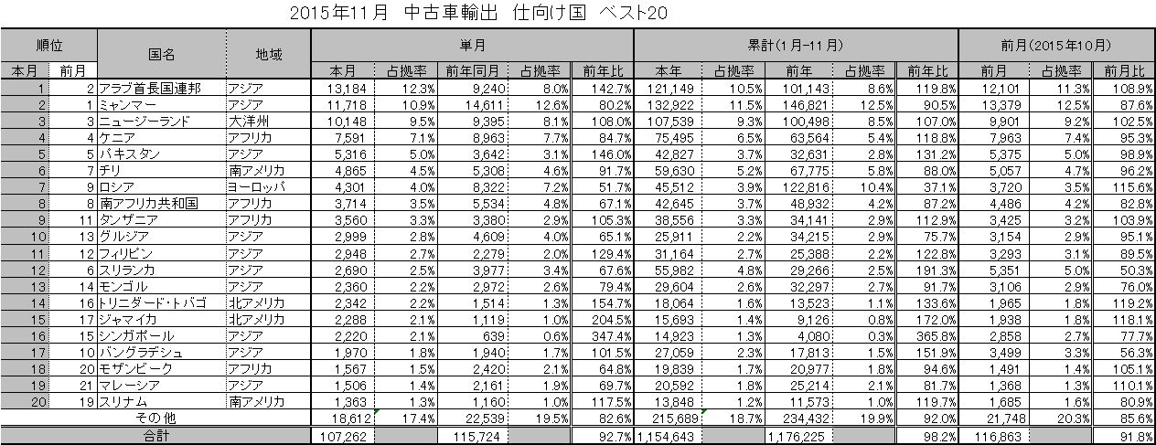 全体の前年比では、7.3%の減少。上位20カ国で伸び率が高かったのは、シンガポール(3.4倍/639台→2220台)、ジャマイカ(2倍/1119台→2288台)、トリニダード・トバコ(1.5倍/1514台→2342台)、でアジア勢や北アメリカが輸出台数を伸ばした。