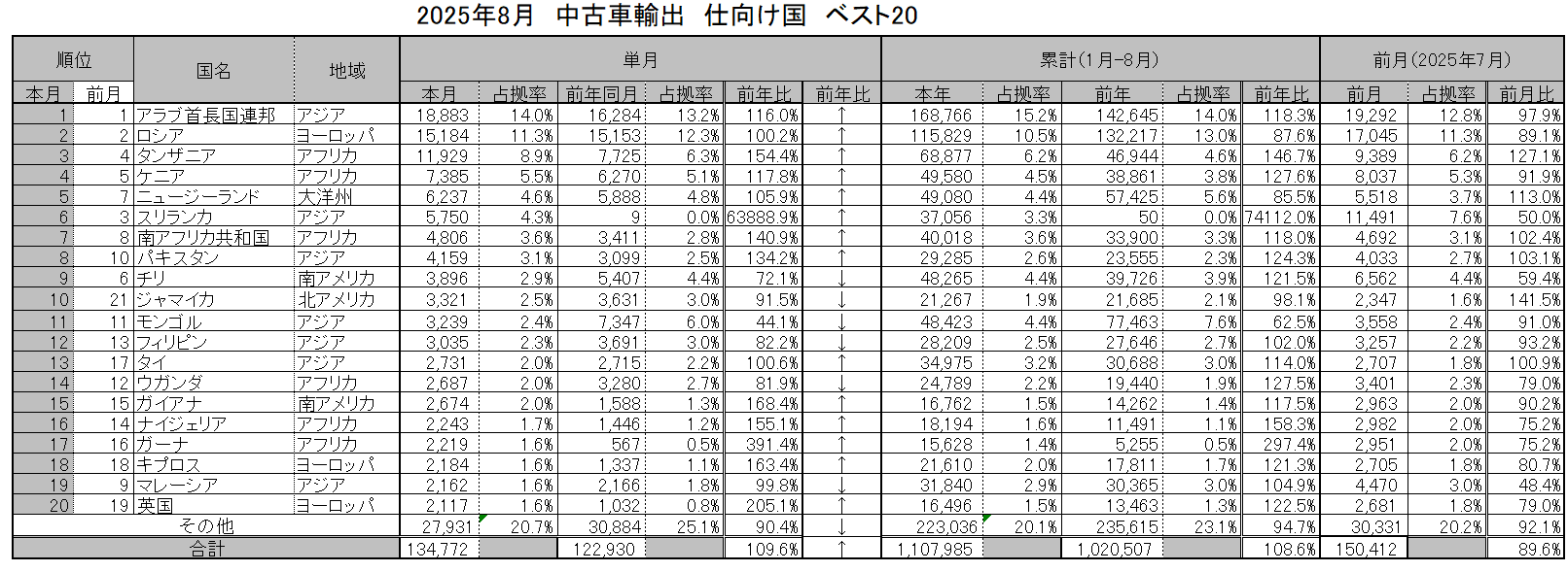 日本中古車輸出業協同組合がまとめた8月の中古車輸出台数は、前年同月比9.6%増の12万2930台だった。仕向け国別では、アラブ首長国連邦が11か月連続で首位となった。同国は、0.2%増の1万8883台。2位のロシアは、同19.2%減の1万5184台で続いた。3位はタンザニアで、輸出台数は同1万1929倍だった。