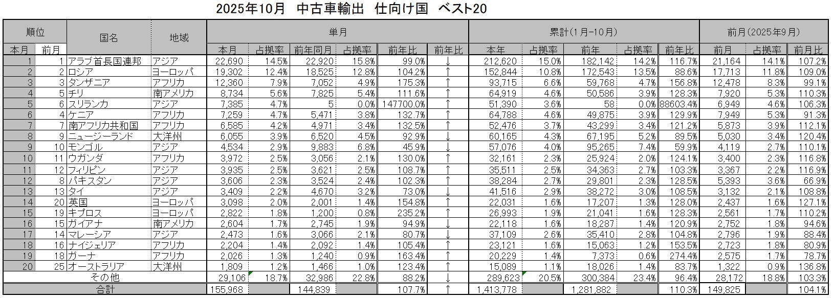 日本中古車輸出業協同組合がまとめた10月の中古車輸出台数は、前年同月比28.6%増の15万5968台だった。仕向け国別では、アラブ首長国連邦が13か月連続で首位となった。同国は、1.0%減の2万2690台。2位のロシアは、同4.2%増の1万9302台で続いた。3位はタンザニアで、輸出台数は同1万2360台だった。