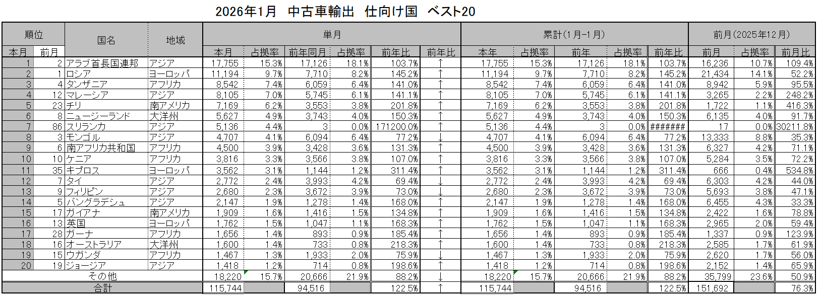 日本中古車輸出業協同組合がまとめた1月の中古車輸出台数は、前年同月比22.5%増の11万5744台だった。仕向け国別では、アラブ首長国連邦が16カ月連続で首位となった。同国は、3.7%増の1万7755台。2位のロシアは、同45.2%増の1万1194台で続いた。3位はタンザニアで、輸出台数は同万8542台だった。 上位20カ国で伸び率が高かった国は、スリランカ、チリ、ガーナなどで、前月比較では、23.7%減だった。