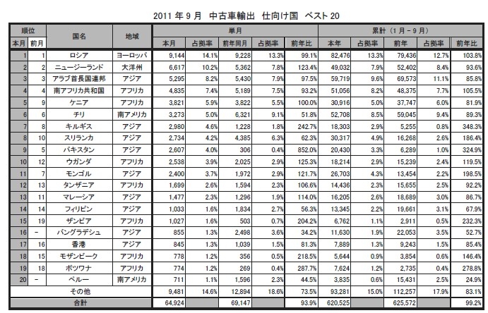 前年同月比較では、全体で6・1%減となる中、約8・5倍の伸びとなったパキスタン、2倍から3倍近い伸びとなったキルギス、ザンビア、ボツワナ、モザンビークといった国が大きく伸びた一方、チリ、フィリピン、バングラデシュ、ペルー、タイ(2245台→677台/69・8%減)、といった国が減少した。