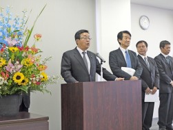 記念セレモニーで挨拶を述べる二村義春理事長