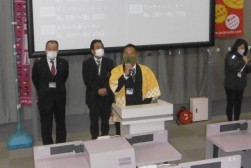 セリ前のセレモニーで小野田理事長は、「今年第一回目の青年部担当AAになります。新型コロナウイルス感染拡大で厳しい中、1200台の目標を立てていましたが、駐車スペースが一杯となり、土曜日11時にやむを得ず満車となりました。出品の準備をしていた会員様にはご迷惑おかけいたしました。今回の出品1505台は1月の青年部では最高の出品となりました。緊急事態宣言の中、ネットからの参加をお願いします。昨年12月より会場内は空間除菌機を導入していますが、マスク、手洗いのうえ参加をお願いします」と述べた。