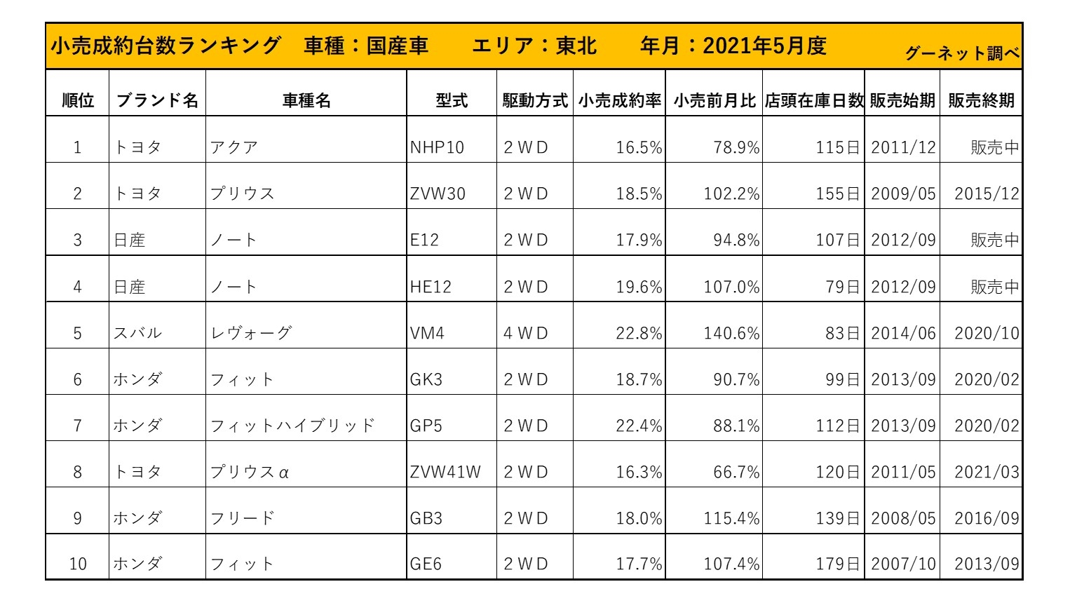 2021年5月度 国産車小売成約台数ランキング【東北エリア】