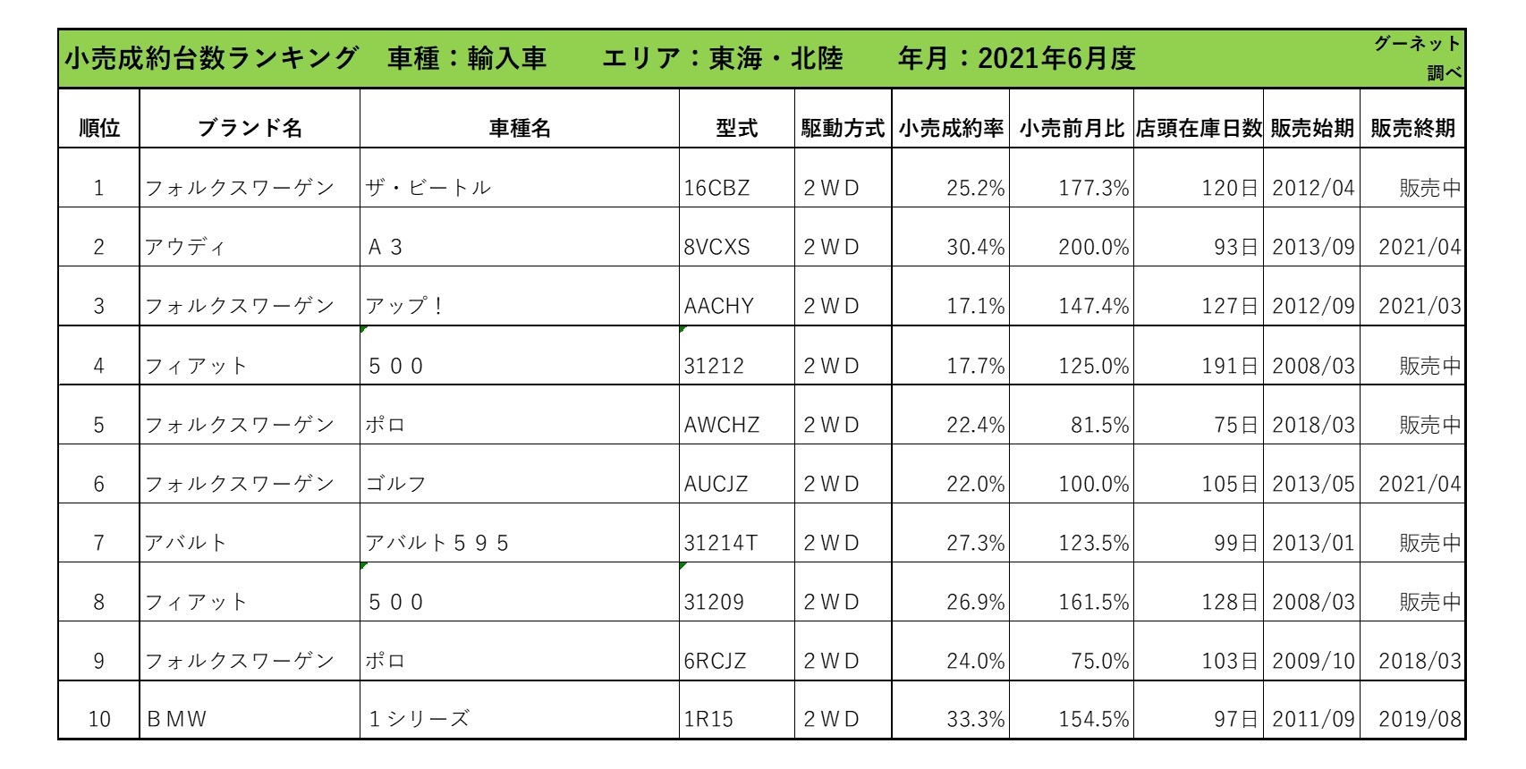 2021年6月度 輸入車小売成約台数ランキング【東海・北陸エリア】