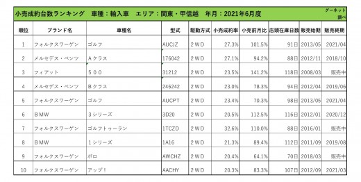 2021年6月度 輸入車小売成約台数ランキング【関東・甲信越エリア】