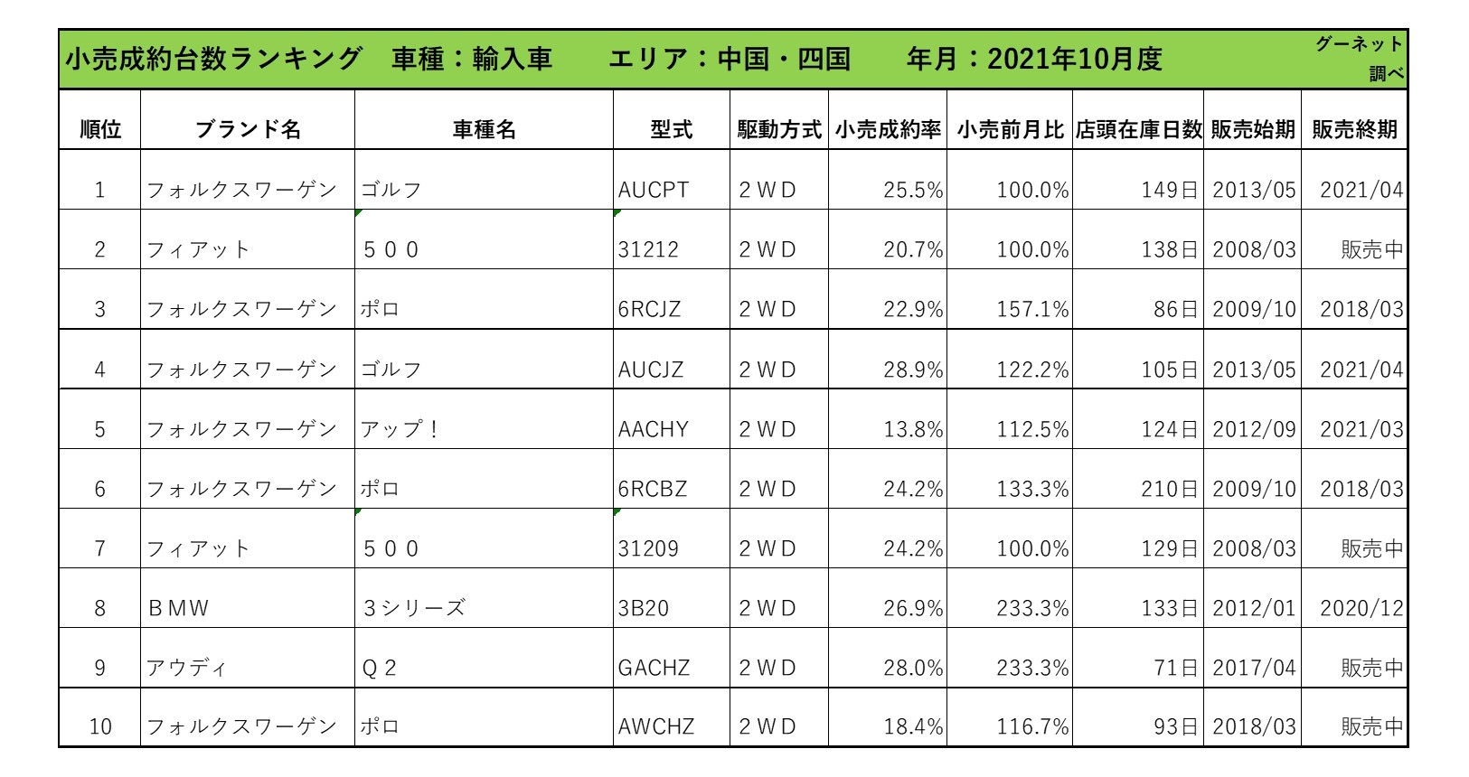 2021年10月度 輸入車小売成約台数ランキング 【中国・四国エリア】