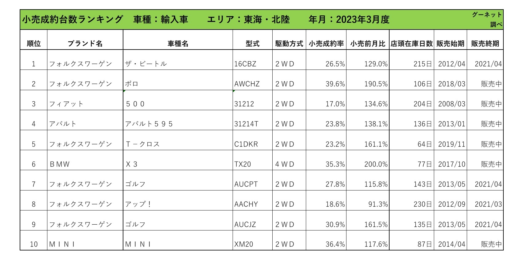 2023年3月度 輸入車小売成約台数ランキング【東海・北陸エリア】