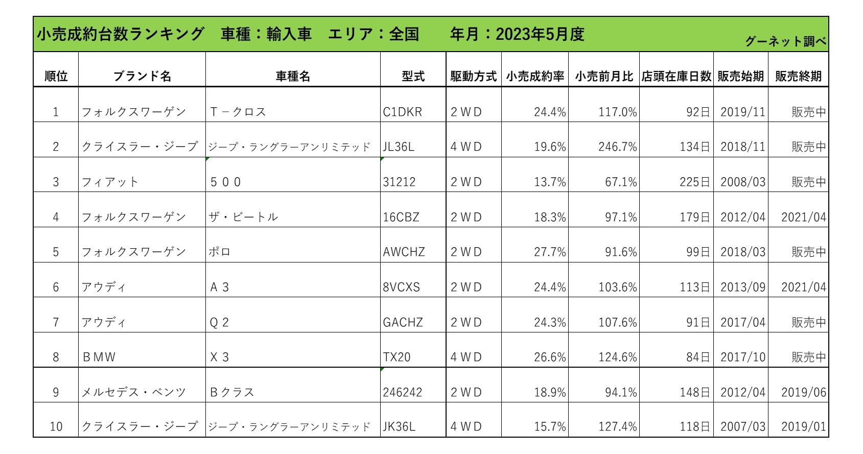 2023年5月度 輸入車小売成約台数ランキング【全国エリア】