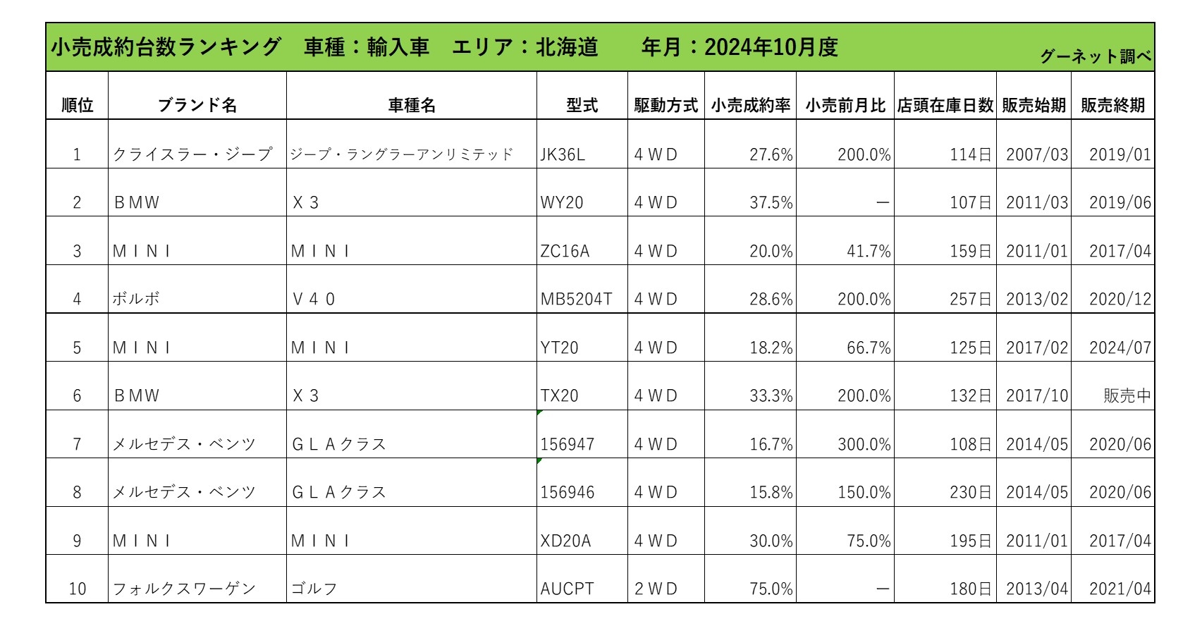 2024年10月度 輸入車小売成約台数ランキング【北海道エリア】