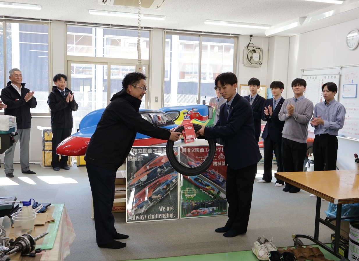 藤吉真澄プロジェクトリーダーからエコランカー専用タイヤが寄贈された