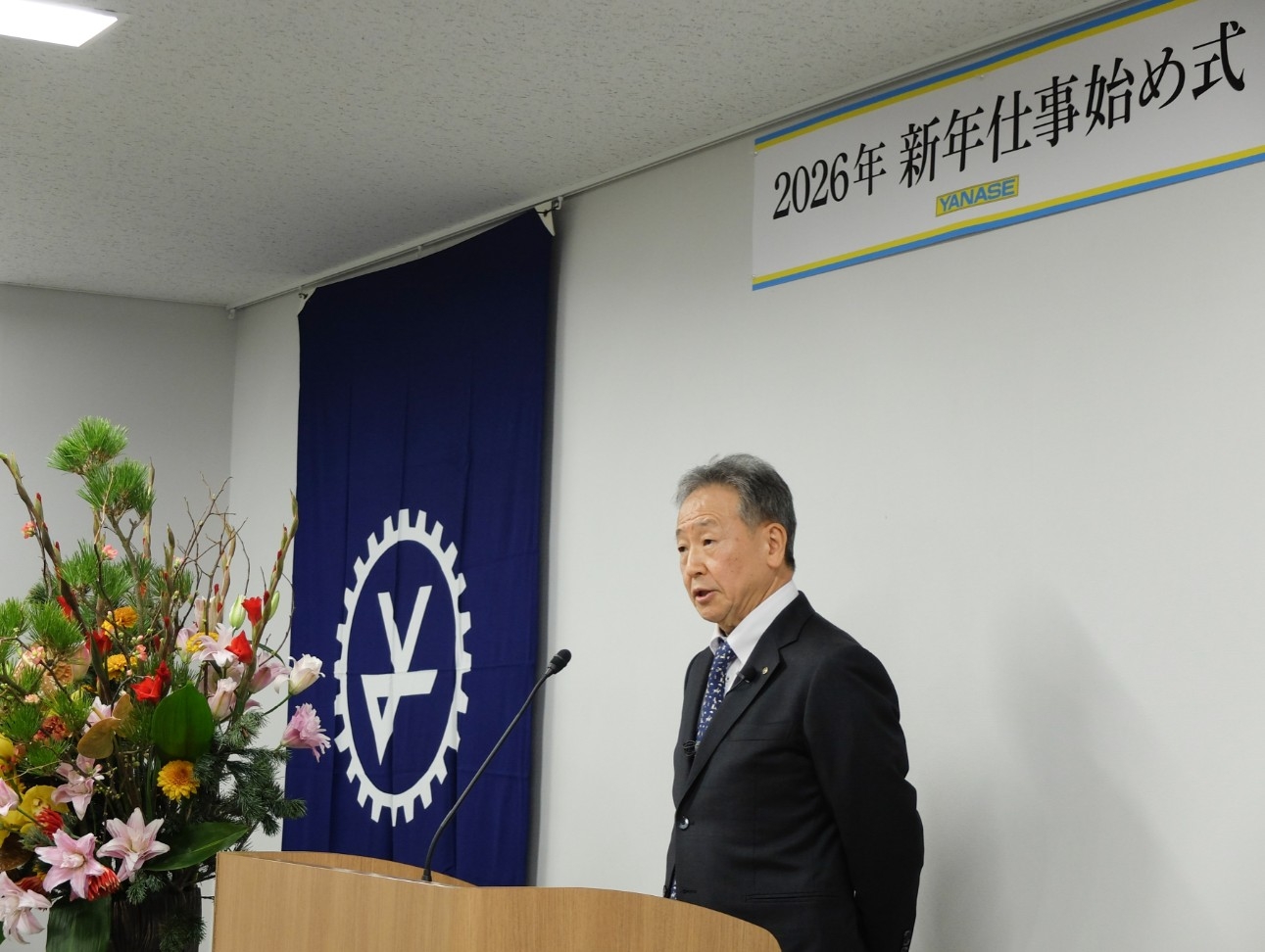 新年仕事始め式で年頭あいさつを述べる森田社長