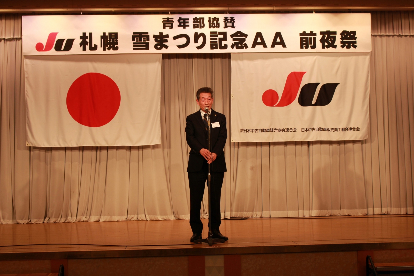 前夜祭で祝辞を述べるJUコーポレーションの海津名誉会長