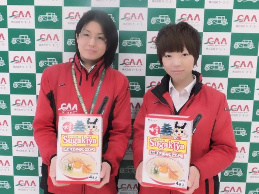 3/19の賞品「寿がきやラーメン」を紹介するスタッフ(左から中村さん、斉藤さん)