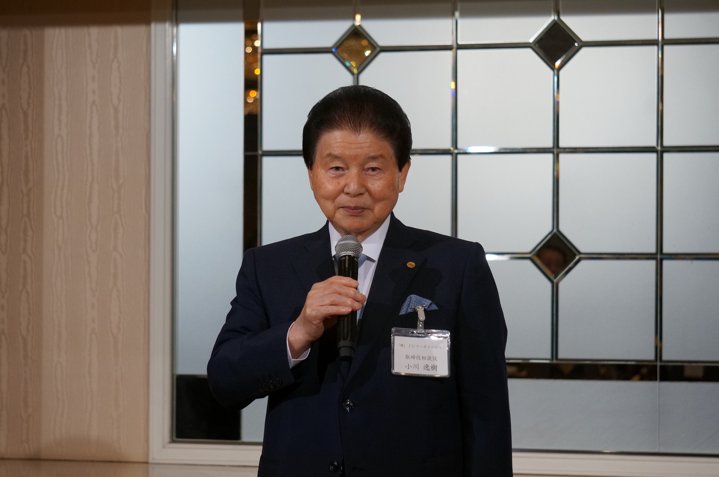 挨拶する小川逸樹取締役相談役