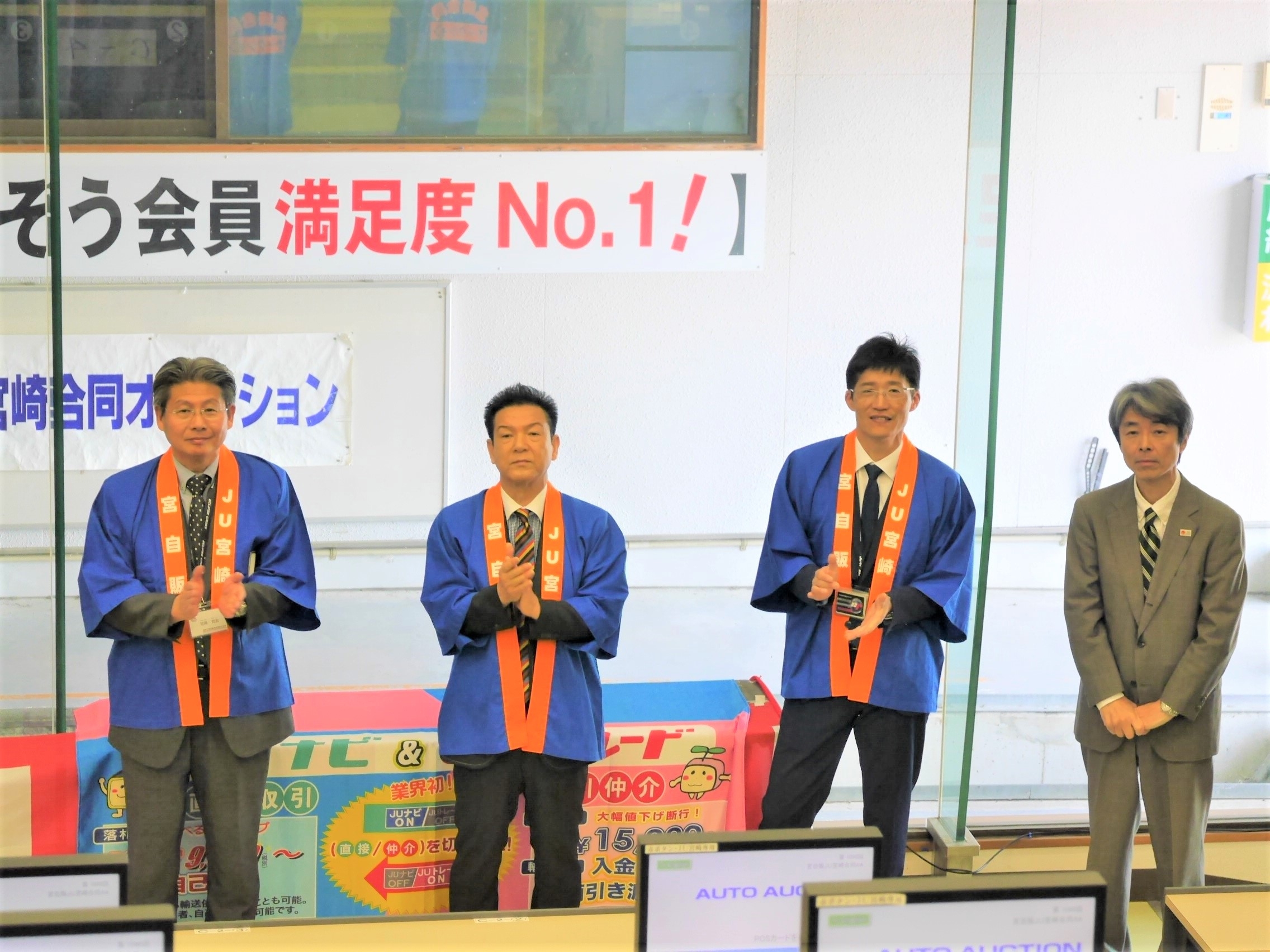セリスタート前にはセレモニーを開催(左から宮自販の笠原中古車部会長、JU宮崎の黒木理事長と小倉孝二副理事長、嘉村宮崎運輸支局長)