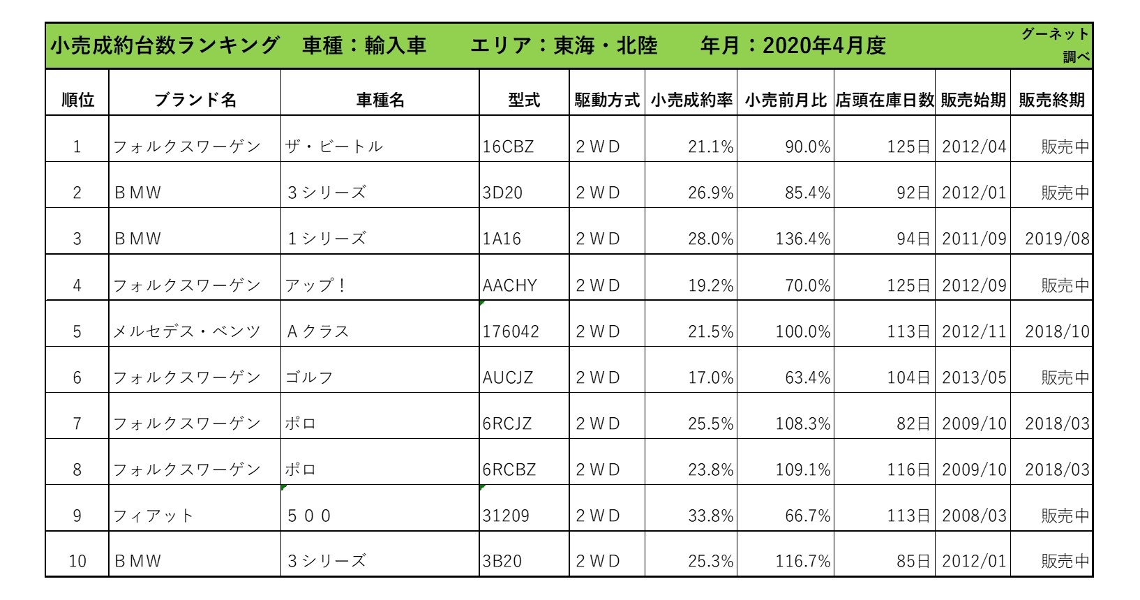 2020年4月度 輸入車小売成約台数ランキング【東海・北陸エリア】