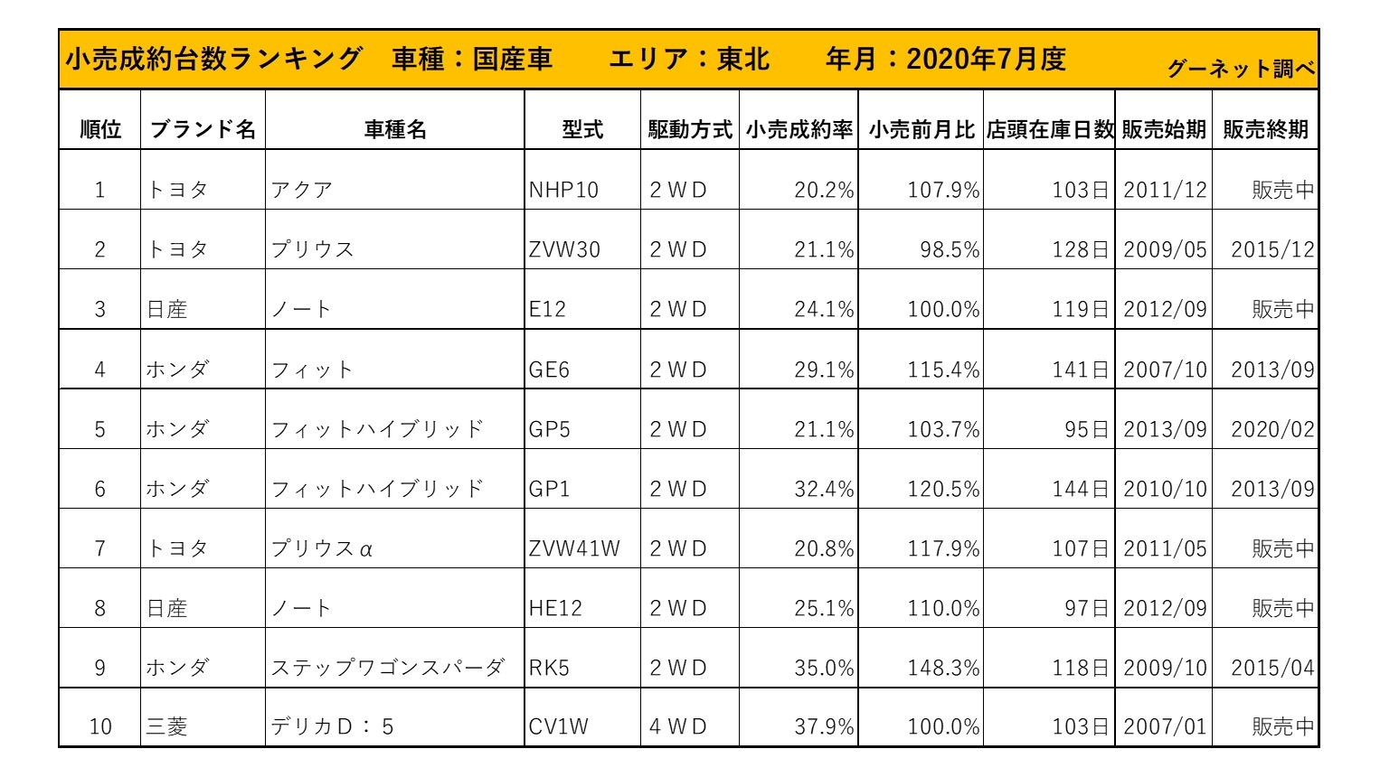 2020年7月度 国産車小売成約台数ランキング【東北エリア】