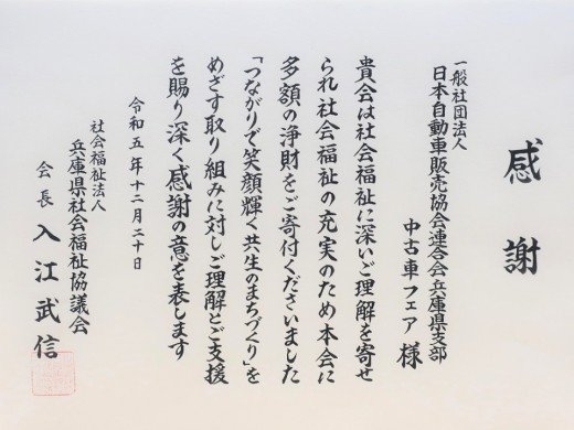 日本自動車販売協会連合会兵庫県支部(瀧川高章支部長)はこのほど、兵庫県社会福祉協議会に浄財50万円を寄付した。寄付金は同協議会により、兵庫県の地域福祉活動推進のために活用される。この寄付金は、自販連兵庫が11月の1カ月間展開した「2023兵庫県ディーラー中古車フェア」の受注台数をベースに企画したもの