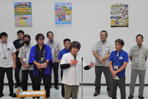 セリ開始前のセレモニーでは池宮城青年部会長があいさつに立ち「皆様のご協力のおかげで、目標400台に対して、516台もの出品車を集め、大きく目標を達成できました。最後まで活発なコールをお願いします」と、感謝の言葉を述べた。