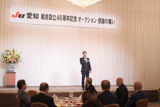 前日には名古屋東急ホテルにて「組合設立46周年記念オークション感謝の集い」と題し、来賓、関係者など約100人が出席した前夜祭を開催した。冒頭で加藤理事長は「本日集まっていただいた『感謝の集い』を皆様との一期一会と捉え、この時間を大事にしたいと思う」とあいさつを行った。来賓あいさつでは、JU中販連・松本富男副会長、荒井商事・荒井寿一会長が祝辞を述べ、JU中販連・奥村悦二流通委員長が乾杯の発声を行った。