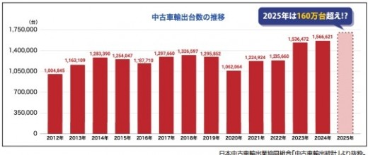 中古車輸出台数の推移が過去最高の年間160万台超のペースで推移している。日本中古車輸出業協同組合(佐藤博理事長)がまとめた「中古車輸出統計」によると、2025年1~7月時点の中古車輸出台数は前年同期比8.4%増の97万3213台に上り、このペースが続く場合、160万台超はもちろん、170万台近い数字に及ぶ可能性もある。仕向け国別で見ても上位10カ国のうち、7カ国が前年同期実績を上回る。スリランカは今年2月、中古車輸入が解禁され、コンスタントに台数を伸ばしていたが、7月は初めて月間の輸出台数が1万台を上回った。今回の特集では、中古車輸出市場の状況と、中古車輸出事業への新規参入のヒントなどを探っていきたい。(室田一茂)