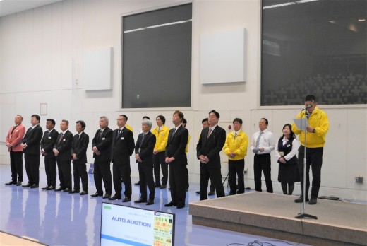 セリ開始前のセレモニーでは、枝村進流通委員長があいさつに立ち「今年1年間で6万7000台を超えるご出品をいただきました。皆様の今年1年のご協力、本当にありがとうございます」と、心からの感謝の言葉を述べた。