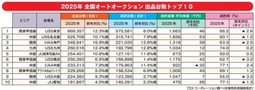 最大手のUSSグループでは、大半の会場が台数を伸ばし、全国トップ10には、1位USS東京、2位USS名古屋、3位HAA神戸、4位USS九州、6位USS横浜、9位USS大阪というように、6会場がランクインした。ランクインした各会場は軒並み過去最高実績だったが、上位4会場はHAA神戸の前年比16.9%増を筆頭に、前年比1割以上の増加だった。HAA神戸とUSS九州は成約台数でも前年比1割以上の増加で「売り」「買い」ともに堅調に推移した。