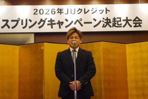 JU大阪(稗田勇理事長)は2月18日、大阪市天王寺区のシェラトン都ホテルで「2026年JUクレジットスプリングキャンペーン決起大会」を開催した。JU大阪役員とオリエントコーポレーション関係者、オータムキャンペーンの優秀販売店が出席、3、4月の2カ月間展開するJUクレジット「スプリングキャンペーン」の目標達成に向け、協力を呼びかけた。