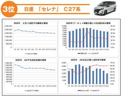 トヨタ「アクア」(10系)、ホンダ「N-BOXカスタム」(JF3・4系)に次ぐ3位にランクインしたのは、日産「セレナ」(C27系)。2024年の6位から3つ順位を上げた。セレナについては「新型車のC28系も市場に行き渡り始め、タマ数が増える中で、人気のトヨタ『ノア/ヴォクシー』(80系)の相場が高く、割安感が拡販の要因になっているのも事実。ファミリーミニバンとしてちょうど良いクルマだが、割安のセレナにユーザーがなびいている」(九州地区の中古車販売店)という。大手販売店の店頭でも、仕入れやすい「セレナ」の在庫が目立つのも事実だ。同ジャンルの他メーカー車の高値相場が影響しているという、珍しいケースだ。もちろん「セレナ」ファンが存在することも否定しないが、中古車の場合、こうした外的要因が販売に影響してくるケースも多々ある。