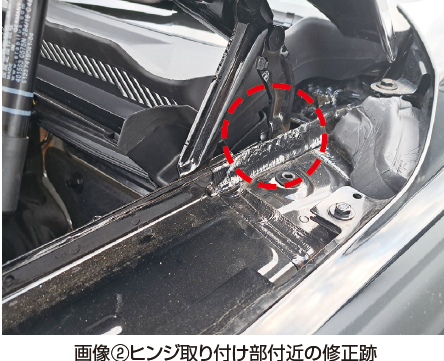 実際、画像②は強風により損傷したボンネットヒンジ取り付け部を板金修正したもので、強風の恐ろしさを感じます。