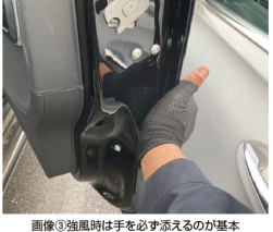 強風を受けて一気に持っていかれるのを防ぐには、とにかく『手足で押さえる』こと(画像③)が大事。