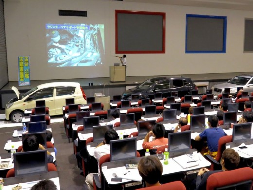 講習内容は修復歴発見技能の基礎講習。テキストを使った査定概要講義やDVDを視聴する座学と実車(日本査定協会とJU愛知が提供)を4台使用して修復歴箇所を直接確認する実技など合計で約3時間30分のプログラム。