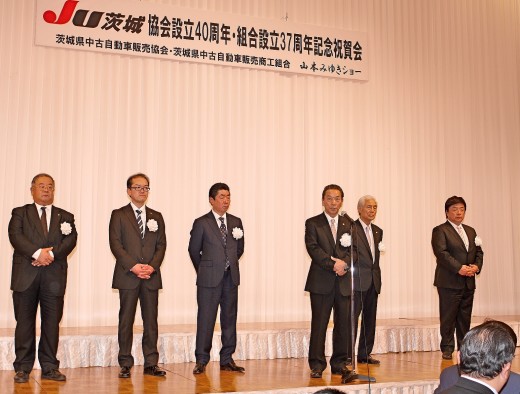 JU茨城(磯﨑孝理事長)は2月18日、水戸プラザホテル(茨城県水戸市)において「茨城県中古自動車販売協会設立40周年・茨城県中古自動車販売商工組合設立37周年記念式典・祝賀会」を主催、JU中販連澤田稔会長(JU静岡理事長)、JU関連協海津博会長(JU新潟理事長)、JU中販連高谷昭彦小売振興委員長(JU栃木理事長)、JU中販連山田久男金融委員長(JU神奈川理事長)など各県JUの理事長。また、衆議院議員の額賀福志郎氏(自動車議連会長・税制調査会小委員長)、同梶山弘志氏(国土交委員長・自民党茨城県連会長)、丹羽雄哉氏、葉梨康弘氏、永岡桂子氏、田所嘉徳氏、石川昭政氏、新谷正義氏。さらに参議院議員岡田広氏(内閣府副大臣兼復興大臣)、同上月良祐氏ら多数の国会議員と茨城県知事・橋本昌氏他、県議会議員らが出席、盛大に祝った。