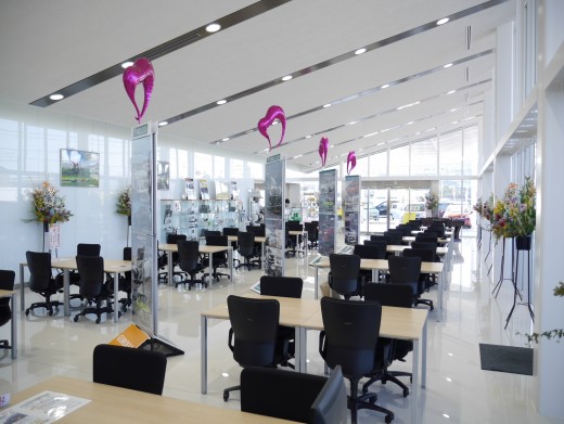 新車と中古車、サービスの来店客を受け入れる大型のショールームには、4人掛けの商談テーブルが15席並ぶほか、レクサス店の「オーナーズラウンジ」を彷彿とさせるサービス待合スペースを設けた。ラウンジ内にも16席を確保するなど、週末の来店を意識した顧客重視のレイアウトと、空が見渡せる大型のショーウィンドウが特徴。新車の車両展示スペースや車寄せには大型のキャノピーを設け、全天候型店舗としての機能を備える。また、広大な敷地内には、「ドッグラン」を併設するなど、幅広いユーザーニーズに対応する。