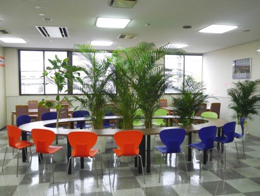 2階部分は、メイン会場内に商談コーナーを移動したことで、来場会員向けの休憩スペースを確保した。たくさんの緑を取り入れ、癒しの空間とした。