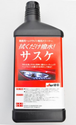 ヘッドライト専用クリーナーのサスケは、ヘッドライトの黄ばみ、くすみ、白濁等を養生なしの簡単作業で綺麗な仕上がりを実現する。ヘッドライト表面の砂・ホコリを軽く落とした後に液剤を硬めのスポンジでヘッドライト全体に塗布、その後塗布した部分をウエスで拭き上げるだけの簡単作業。ヘッドライトの汚れを浮かせて落とすと同時に撥水コーティングが施される。両商品ともにJU岐阜の会員専門に取り扱っている(各都道府県の取扱い先は問合せ)