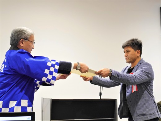 セレモニーで挨拶に立った羽田社長は「好調な世界経済に支えられ、トラックの輸出市場も堅調に推移しています。こうした中、2017年のIMA3会場合計出品台数は12万台に迫り、過去最高の実績を残すことが出来ました。この九州会場も全会場をけん引する高い実績を残すことが出来ました。18年も明るい材料の多い年となりそうですが、この1年はオークション運営を通じて、さらに皆様のお役に立てるよう、努力してまいります。九州会場も新会場で早6カ月を迎えましたが、皆様のご支援に心から感謝いたしますとともに、さらに改善を進め、さらに使っていただける会場を目指します」と話した。