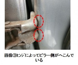 ドアが少しだけ開けることができるのなら、車内側から確認できる場所もあります。それは“ドアヒンジ取り付け部付近”です。ドア側から入力した衝撃エネルギーは、このヒンジを経由してピラーへとダメージが波及していきます。ドアが開く側のヒンジ取り付け部と比較し、不自然に隙間が開いているようであれば、損傷している可能性が高くなります(画像③)。いずれにしてもドアをぶつけて傷つけないよう確認の際には十分ご注意ください。