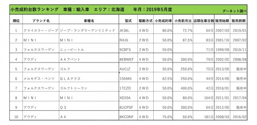グーネット調べによる小売成約台数ランキング(月度)を掲載しております。全国7ブロックで小売りで成約となった販売データですので、仕入れや売却の参考にお役立てください。