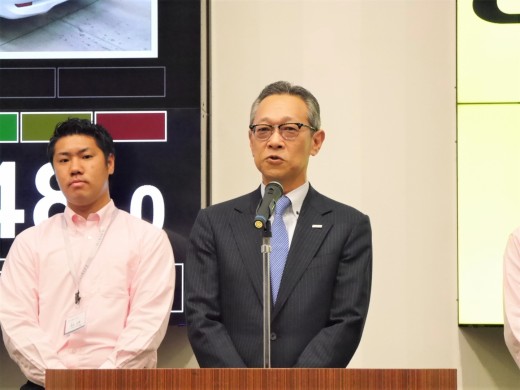 セリ開始前のセレモニーでは伊藤社長が挨拶に立ち「当会場は1985年7月13日、ハナテンオークションとして出品台数275台を集めて第1回AAをスタートしました。以来、35年間1700回もの開催回数を誇る老舗会場です。今回ご縁があり、この伝統ある会場と経営統合させていただくことになりました事、会員の皆様はもちろん、関係する多くの会社の皆様に心からお礼申し上げます。ミライブの経営理念は『創造的挑戦』です。これからも会員の皆様のご商売のお役に立てるよう、さまざまなことにチャレンジしてまいります。来年6月には「ミライブ愛知」が開業予定ですが、東名阪3会場となることで、より応札力の強い、『売れる』『買える』会場作りに邁進してまいります。ミライブの語源は『未来』と『ドライブ』です。これからも会員の皆様と共に、未来に向けてドライブを続ける所存です」と意気込みを話した。 挨拶の中で、高本理氏の会場長就任も報告した。