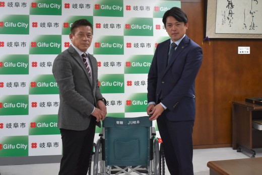 JU岐阜(岐阜市日置江、横山隆仁会長・理事長)岐阜支部は3月30日、岐阜市へ車椅子および寄附金、防犯ブザーを寄贈した。それにともない岐阜市役所にて寄贈に対する感謝贈呈式が行われ、柴橋正直市長より森嵜正利岐阜支部長へ感謝状が手渡された。